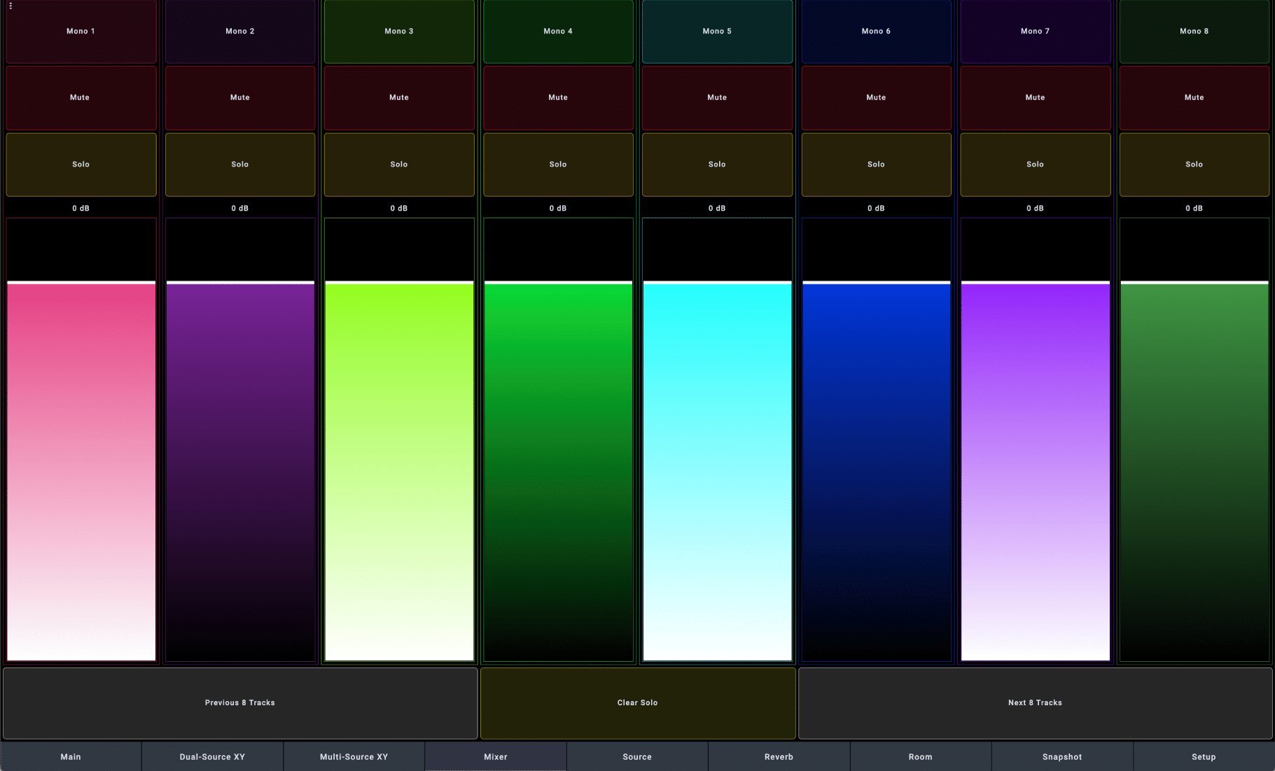 To move from one bank to another (the top 8 sources, then the next 8, etc.), simply use the next and previous buttons. To top it all off, a clear solo button is available if you currently have a solo enabled somewhere in the project.
