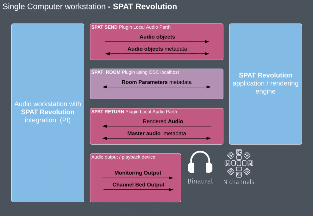 While the audio is handled by a high channel-count audio interface , the use of the SPAT plugin suite still applies. This means as well that you can move from a single computer to a dual computer workflow easily. By default, when the plugins aren’t using the FLUX:: LAP feature, they are sending/receiving the automation via network using OSC commands to SPAT Revolution.