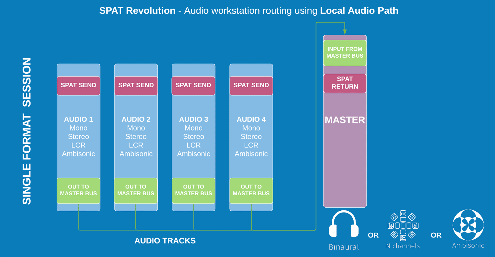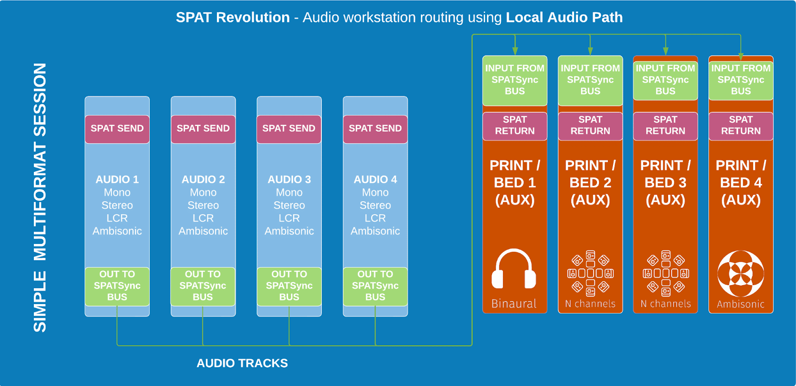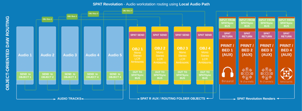 To ensure proper synchronization for this integration, you have to make sure to follow the proper routing of those tracks to maintain good sync. We often refer to this common bus as the SPATSync bus, something that we referred to in the past as the “Dummy bus.”