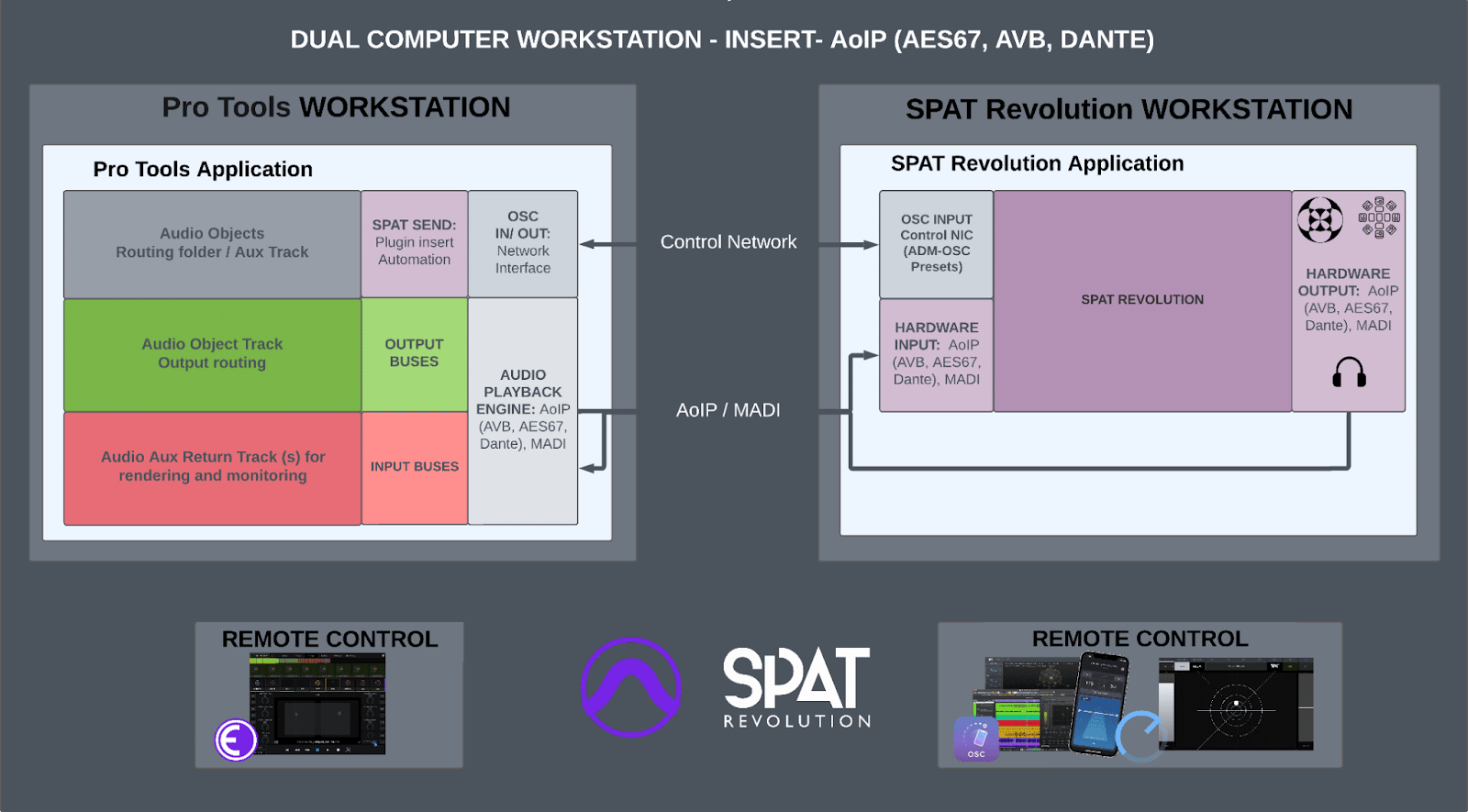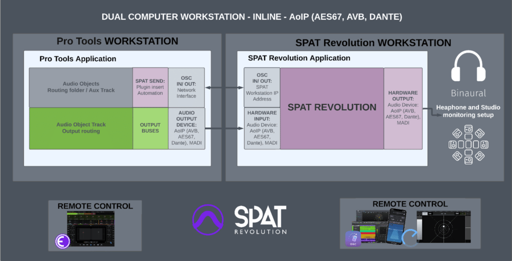 Recommended for larger studio session projects (with many plugin processing or with video track) or for real-time/live production ,the dual computer scenario is simply to have a computer for the Pro Tools playback while the second dedicated computer handles SPAT Revolution real-time rendering. The mechanism for routing in this case relies on an high-channel-count audio interface such as what is possible with AoIP (AVB, AES67, Dante), MADI, Soundgrid and the likes.