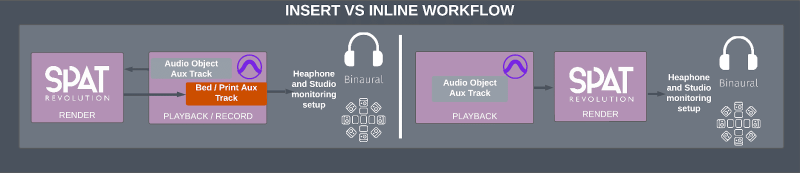 In each case, we are looking at using SPAT Revolution with a Pro Tools environment to render, highlighting the need for audio routing and good practice to maintain synchronization.