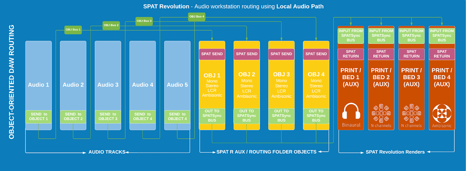 It involves routing all your SPAT Objects to a single SPATSync bus and making sure the SPAT Revolution return track(s) in Pro Tools, hosting the SPAT Return plugin, are patched to this bus as an input.