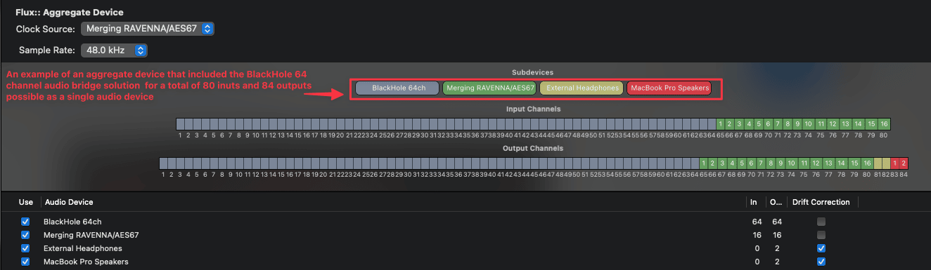 From the example above, you can then route the SPAT Object on channel (from 1-64) of your aggregate device (the BlackHole 64 channel device for example) while being able to return from SPAT Revolution on some of these 64 channels but being capable to use channel 65-80 to route your monitoring buses. (In the above case to a Merging Technology AES67 driver)