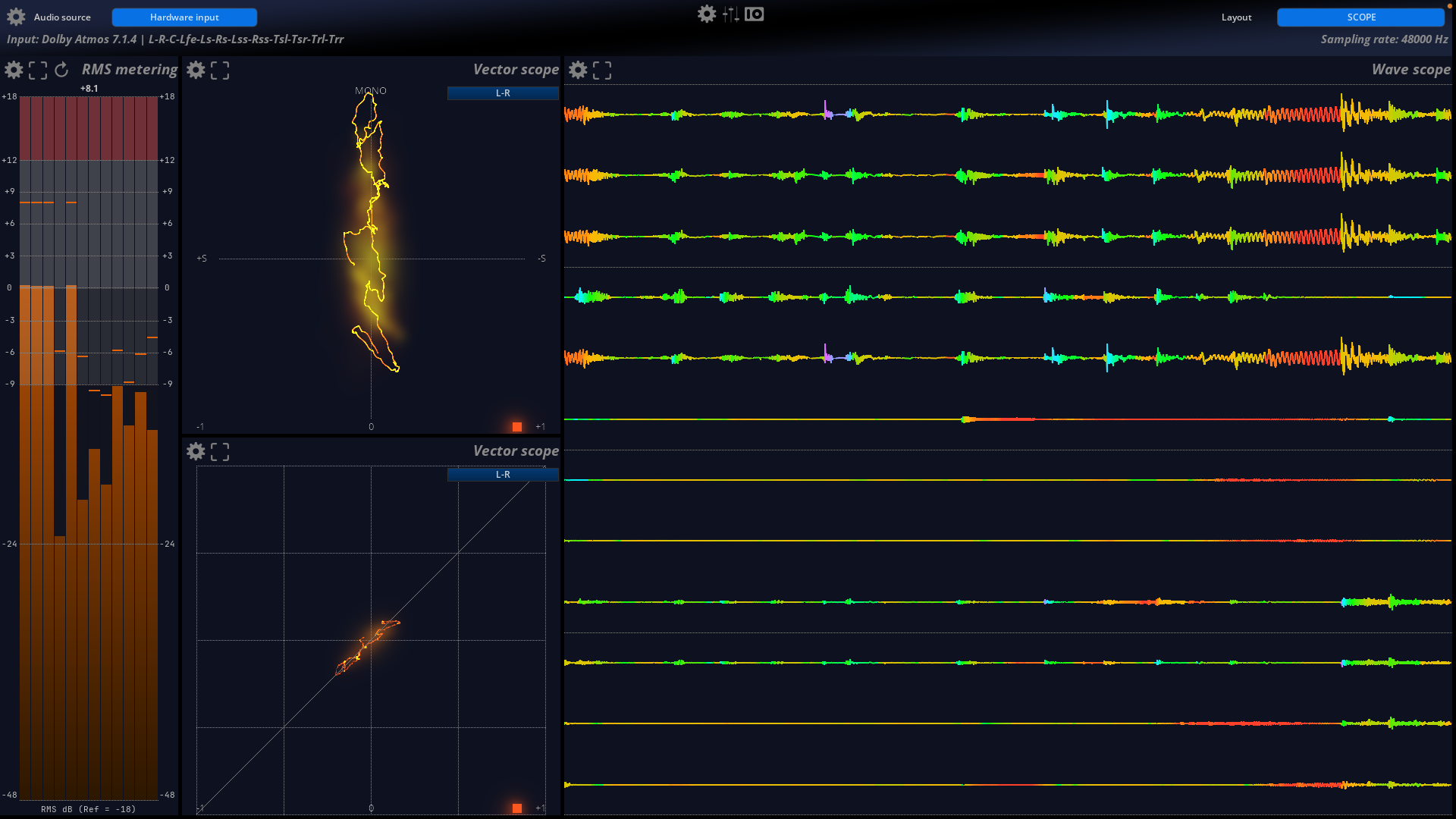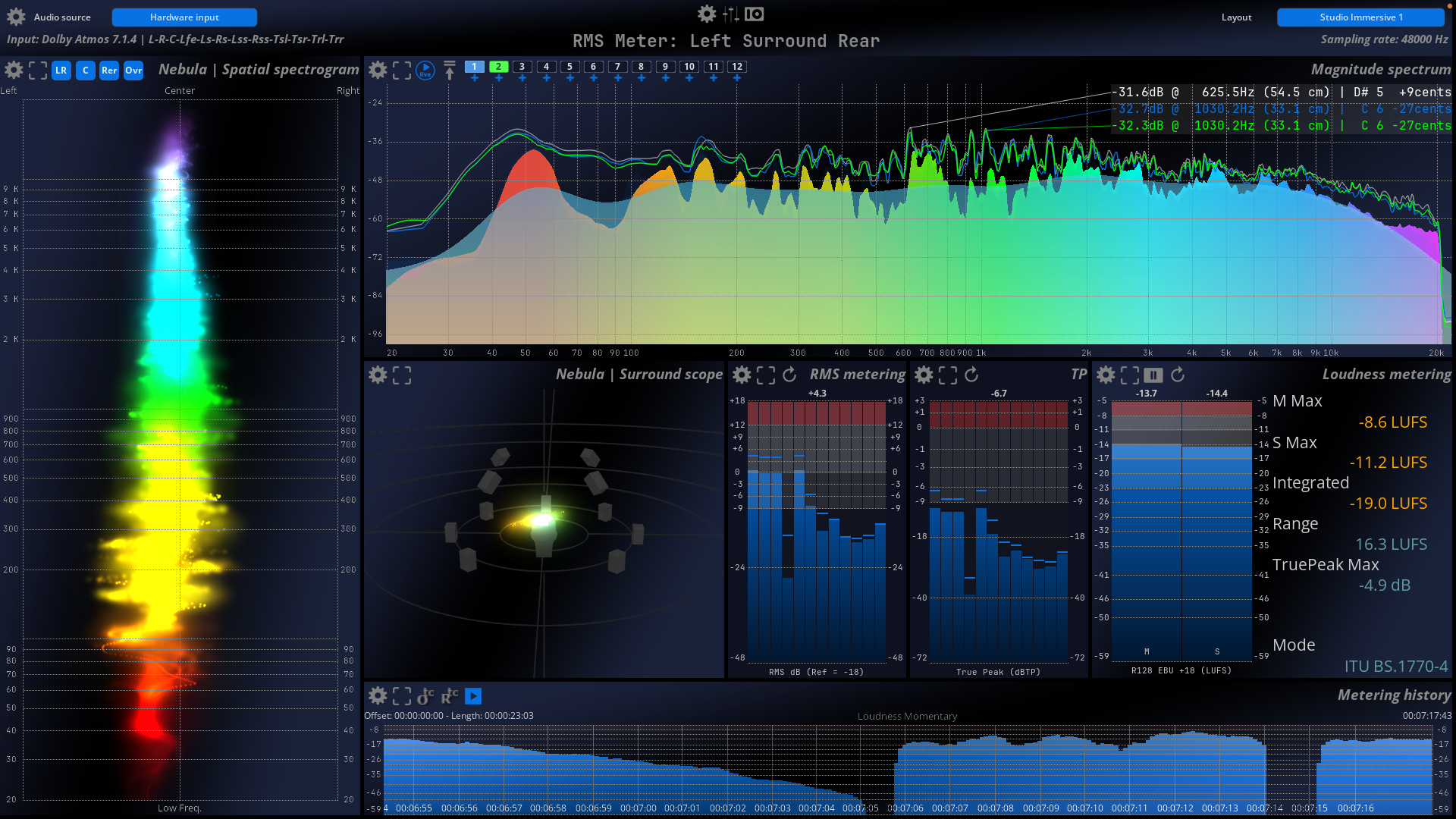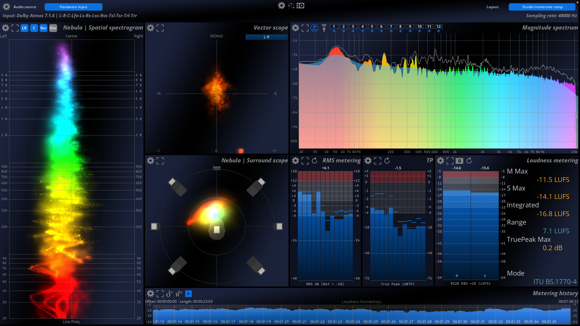 Mix with confidence and be in full control in a reactive, real-time environment. MiRA Studio is the first immersive audio analyzer with support for up to 24 channels for workflows in Dolby® Atmos, Auro3D, NHK 22.2, and other multichannel formats and speaker arrangements, featuring customizable layouts and workspaces tailored to your specific needs. The unique FLUX:: Nebula visualizes the spatial sound field in a scope spectrogram for multichannel analysis in up to 24 channels.