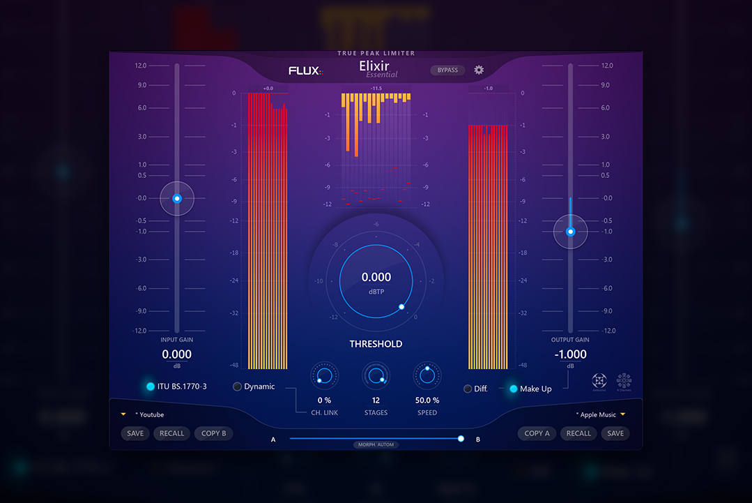 Elixir’s straightforward user interface makes it exceptionally easy to achieve great results, even under a tight deadline. Simply set the input level, adjust the Threshold according to the amount of limiting desired, and finally enable Make Up for gain compensation and loudness addition – That’s it!