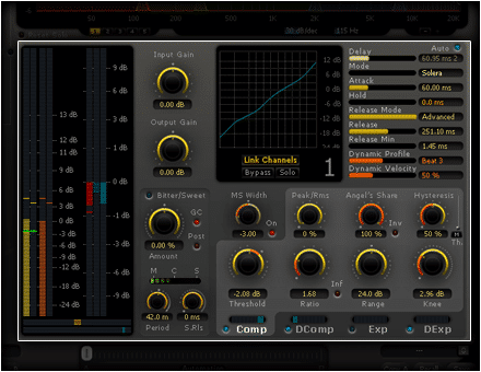 Solera is a comprehensive full band dynamics processor combining the power of a compressor, expander, de-compressor and de-expander, all four processing in parallel, designed to provide powerful dynamics processing for any challenging situation and still preserve, or recover, the true natural quality of the audio material without adding any artifacts.