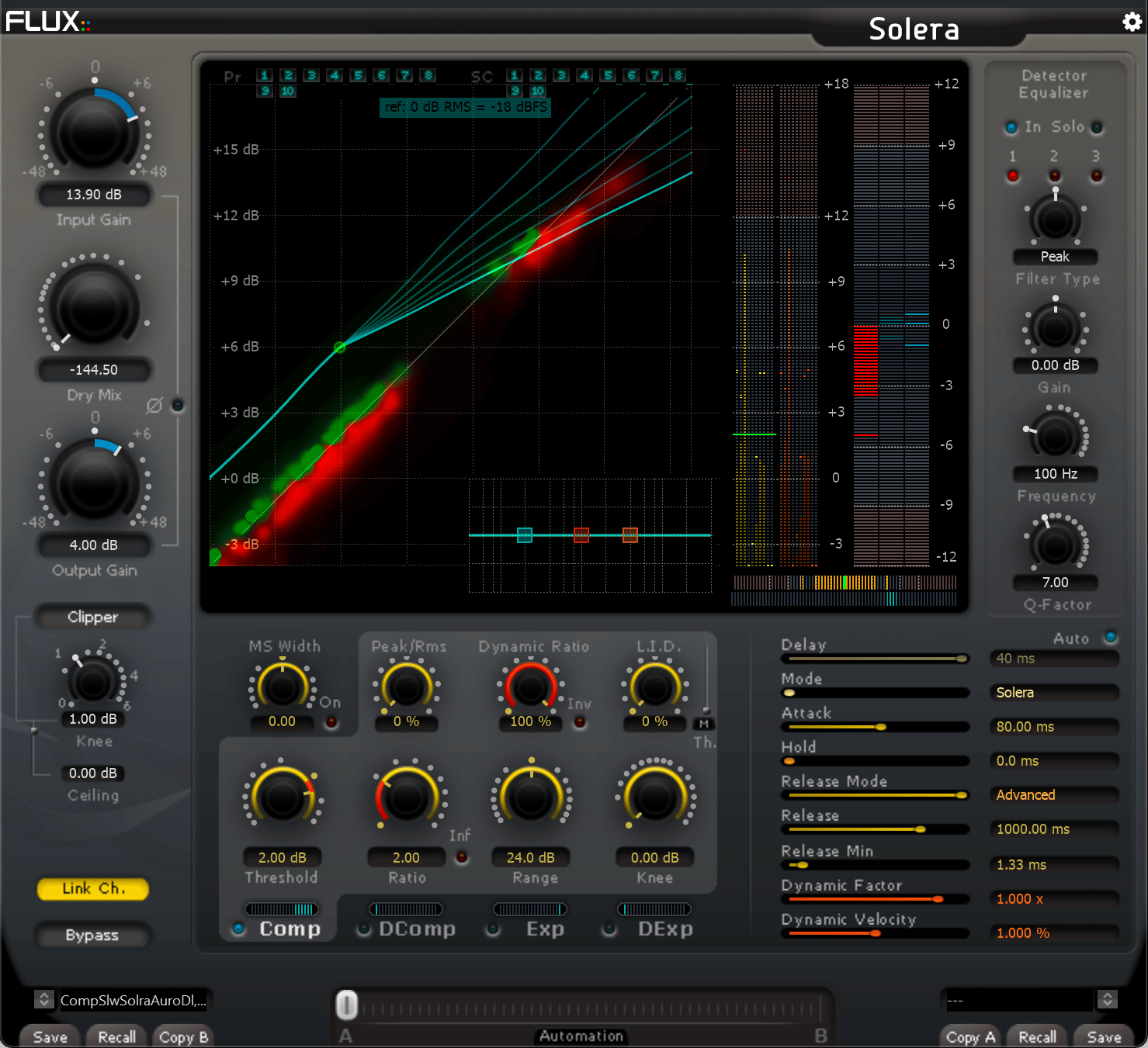 In addition to the common controls on a dynamics processor; ratio, attack, release, Solera offers control over the fundamental characteristics of the dynamics processing, all in order to provide full control over the processing even in the most demanding situations.