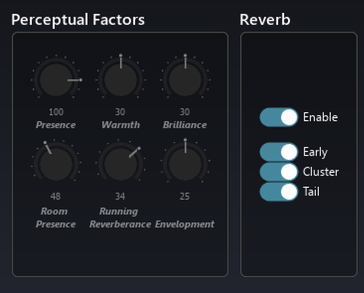 Further on we have the Room Presence (Prominence of the reverberation with respect to the source,), Running Reverberance (amount of perceived reverb when feeding a continuous music message, where the overall sound is a tight blend of the dry and wet signals and the reverb part cannot be mentally separated.), and the Envelopment (corresponds to the perceived notion of how much the listener is being surrounded by the ambient sound).