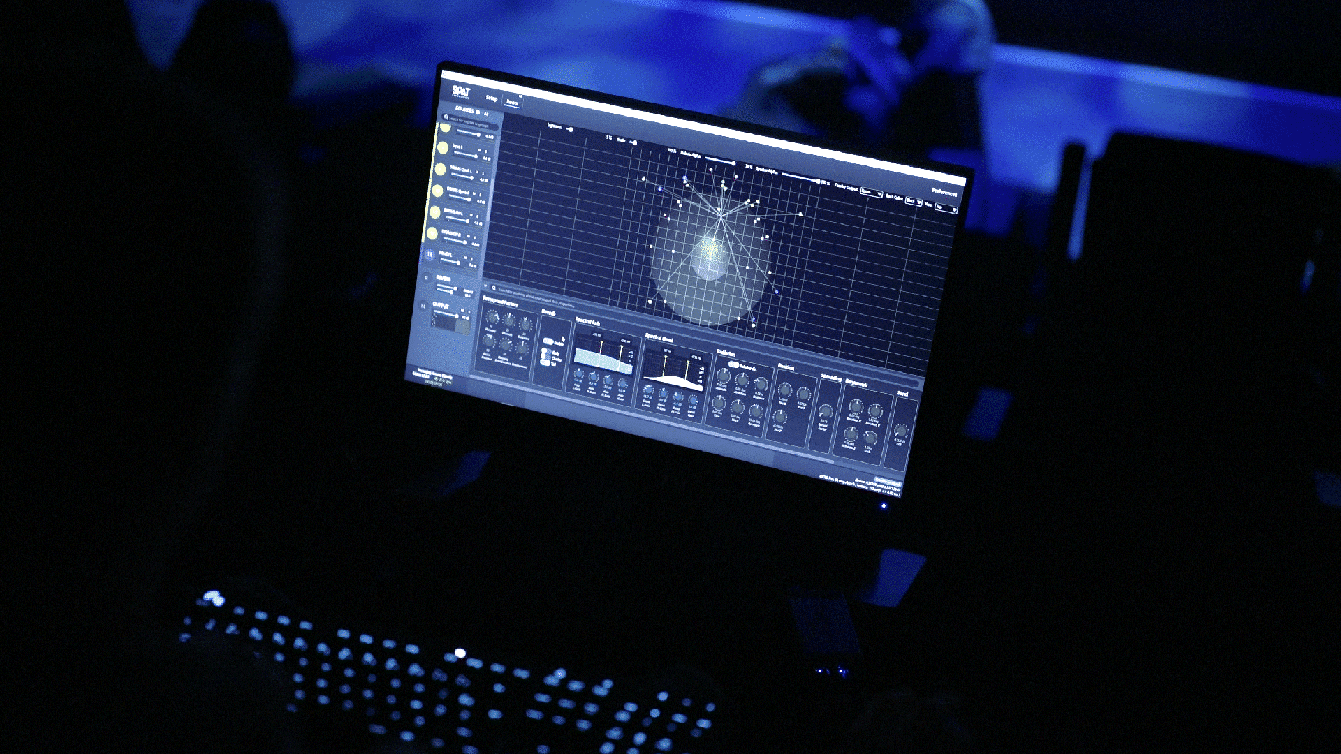 The on-site system relies on eight main speakers surrounding the listener, and using the blueprint of their placement, provided by the NEXO NS-1 system, the speaker arrangement was sketched up in SPAT Revolution. By entering the placement of each speaker into the SPAT and from that configuration create a binaural simulation, the engineer can then listen in binaural from home, or anywhere outside the venue, and get an idea of what may happen during the show.