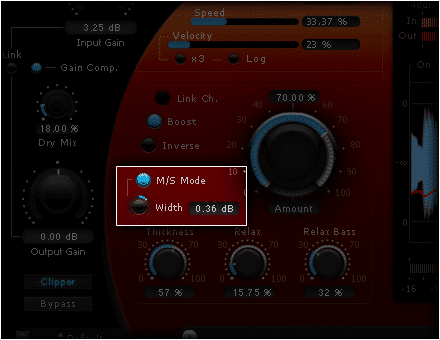 Syrah provides an option for individual processing of the M/S components, a well-known technique often used in mastering to process the stereo image or the center impact, and since Syrah adapts the processing to the audio material, the result will generally match the stereo material more accurately, resulting in a larger variety of possible sound modifications, such as; dynamically increasing the space (room) impression, boost the main center components and similar tasks.