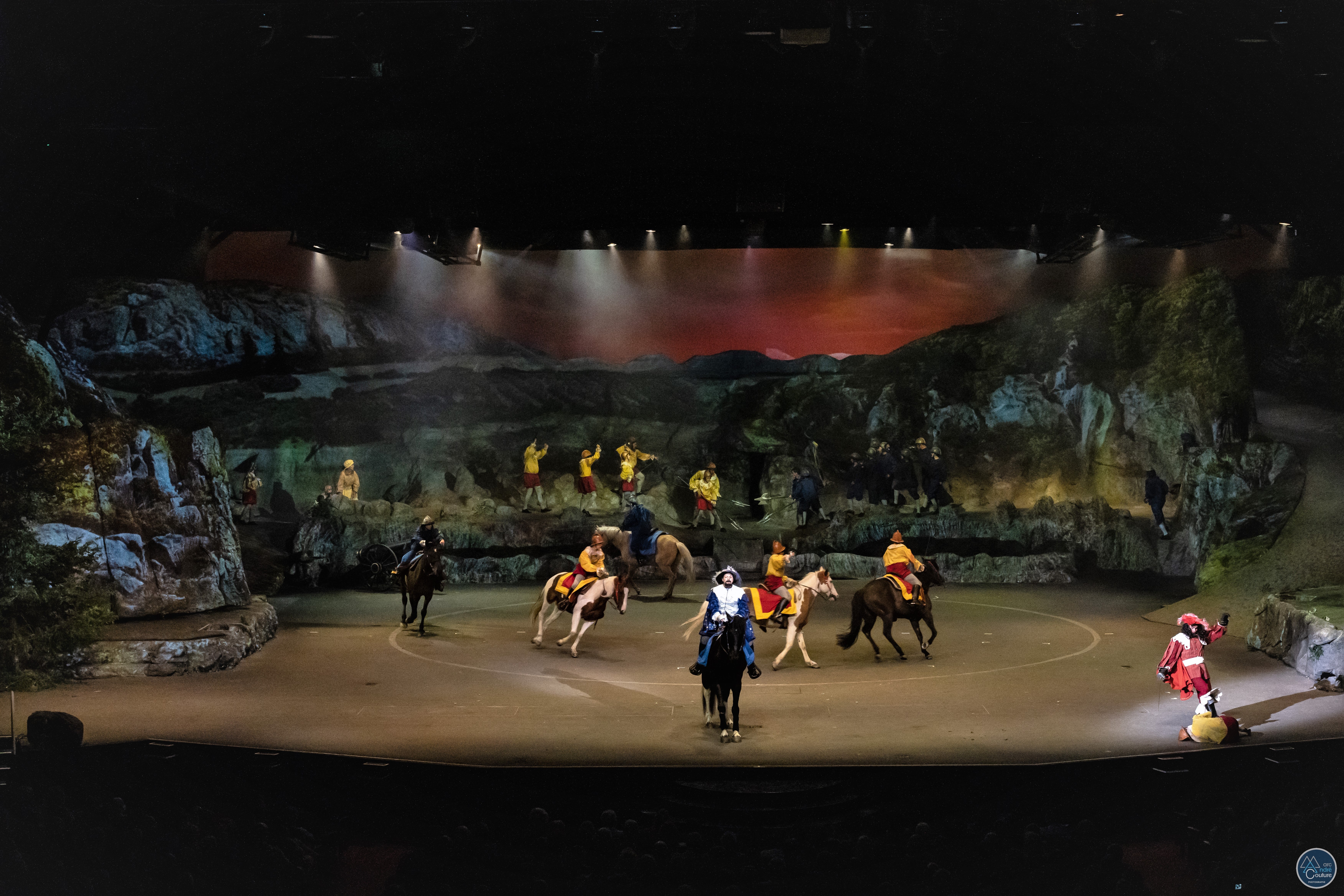 The show, seen by more than 1 300 000 spectators and with nothing less than 150 volunteer actors who take the stage representing up to 12 roles each, is a spectacular production featuring fire, water, helicopters, cannon shots, horses and other animals in an unprecedented sound and visual performance, taking place at the Théâtre du Palais Municipal in La Baie, Saguenay, the largest stage in Quebec with a capacity of up to 2300 spectators.