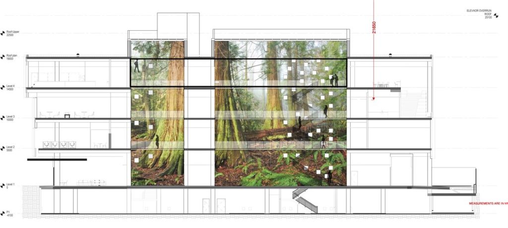 “My vision for the BCIT commission was to create an immersive nature experience that would bridge the campus to the wilderness. In the atrium, on the giant open wall, spanning over 4 floors (25m x 25m), a life-scale image of an iconic Pacific Northwest landscape would visually transport the viewer, while a 32-speaker sound installation would immerse their audio sensory.”, said Fox.